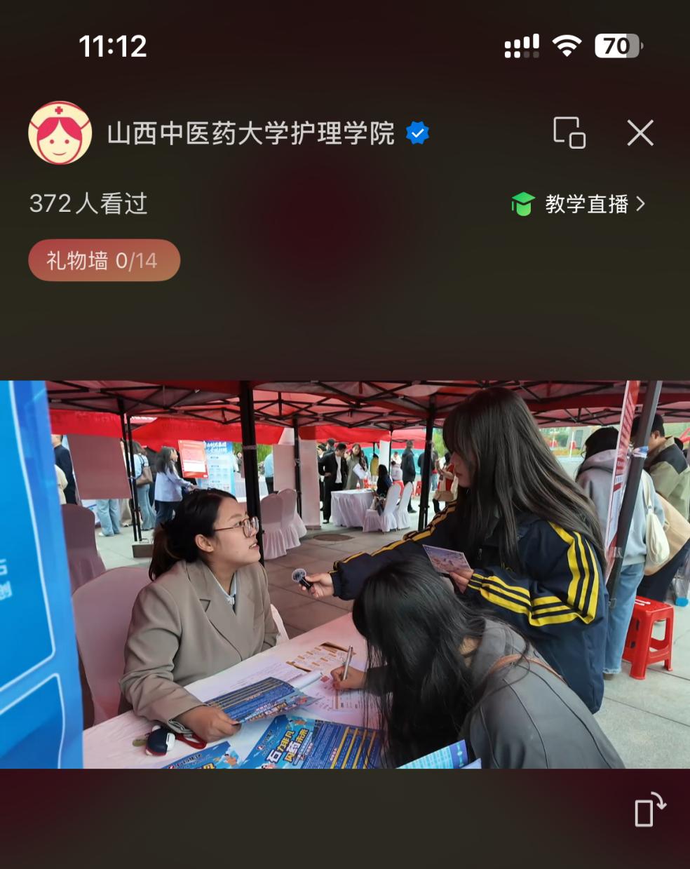 金秋揽才正当时,就业服务启新篇。在学校2026届毕业生秋季双选会举办期间,护理学院创新就业服务模式,以“直播带岗”搭建云端对接桥梁,将传统线下招聘场景转化为沉浸式、互动式求职体验,为我院毕业生与医疗单位打造精准高效的供需对接平台,以数字化赋能高质量就业。