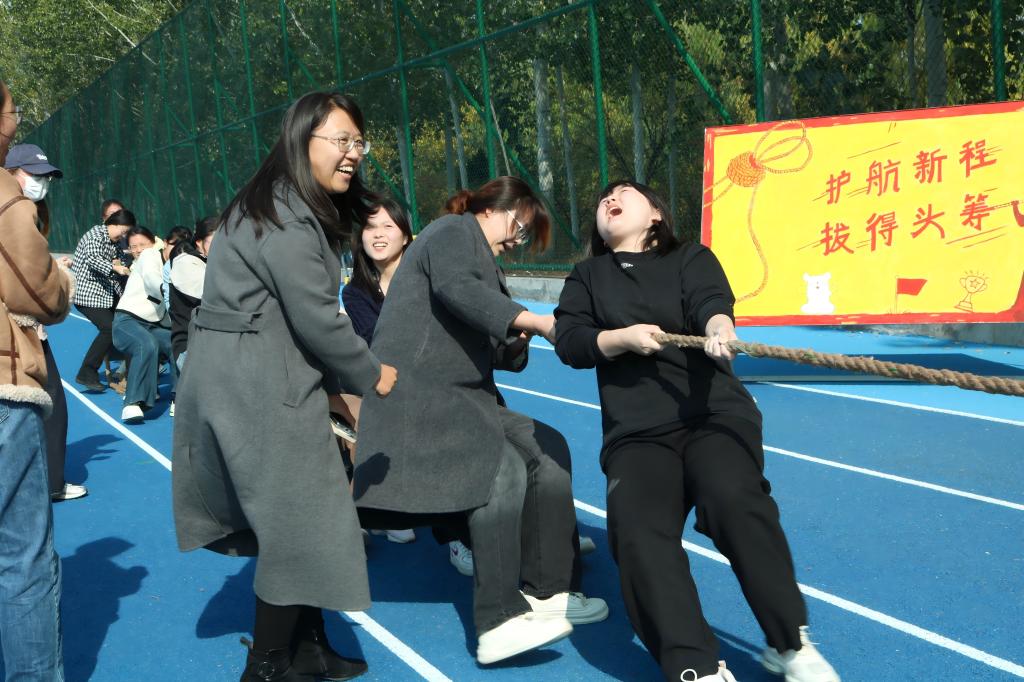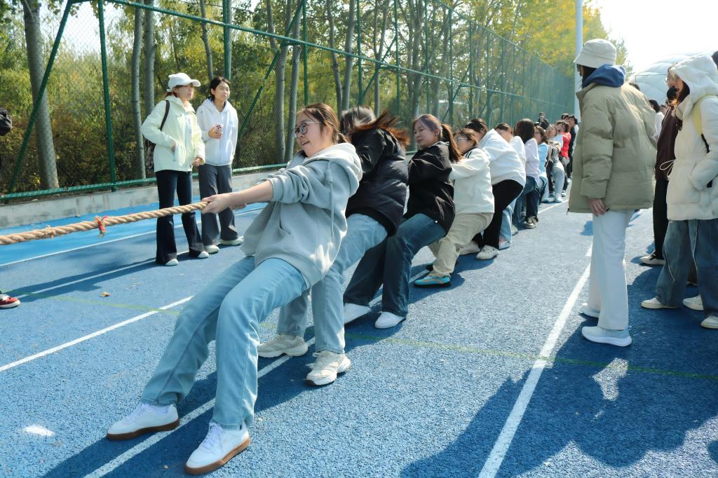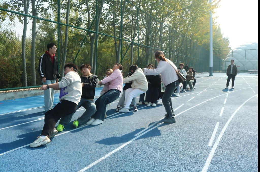 赛场上,各参赛队伍展现了极高的热情与斗志。队员们脚蹬地面、身体后倾,紧握绳索的双手青筋暴起;场边的加油呐喊声此起彼伏,助威声浪一波高过一波。老师们也积极参与进来,与同学们进行了友谊赛。