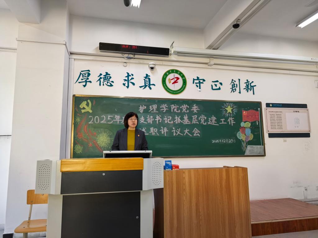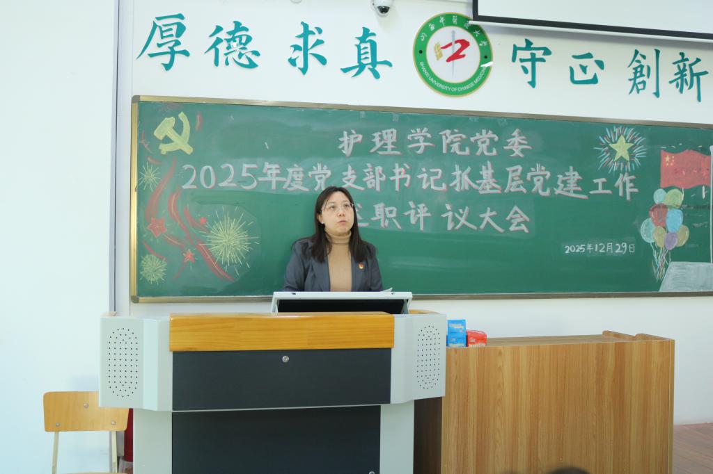 为进一步贯彻新时代党的建设总要求和组织路线,落实高校党建工作规范提升专项行动部署要求,12月29日下午,护理学院党委在仁爱书院307教室召开2025年度党支部书记抓党建工作述职评议考核大会。学院党委副书记巩文娟主持会议,学院党委班子成员、各党支部书记、教师党员及学生党员代表参加会议。