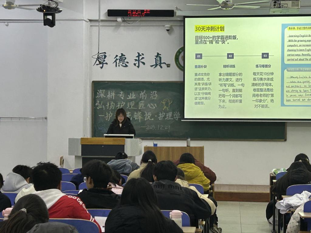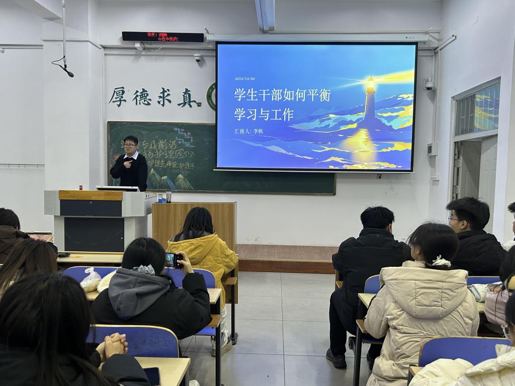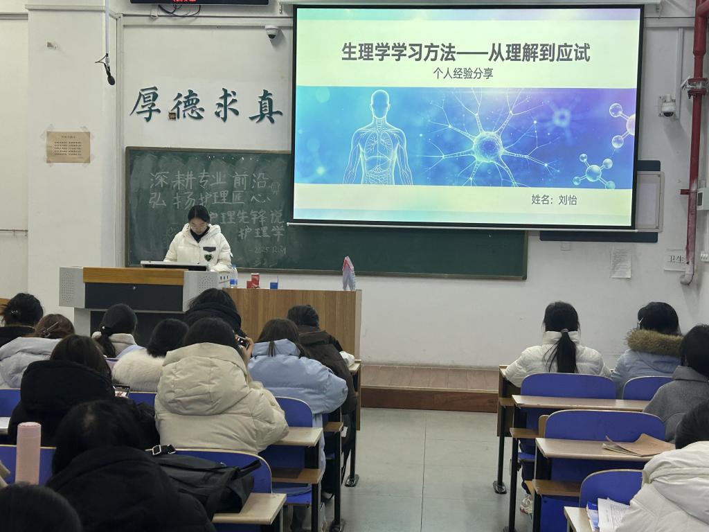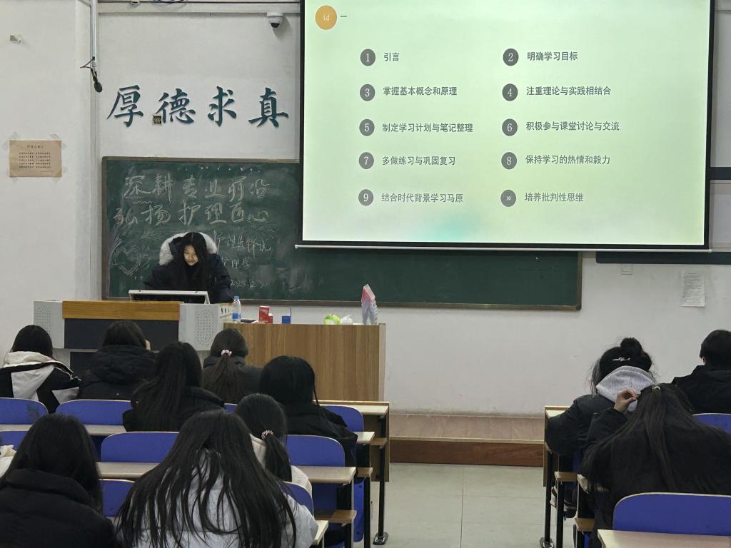 本次分享内容扎实且极具针对性:在四六级备考方面,强调“真题为王”的策略,并特别梳理护理专业高频词汇,助力语言能力与专业应用相结合;生理学等专业核心课程的学习,则倡导“理解优先、框架为要”,从日常积累、考前冲刺到应试技巧,全方位拆解难点;针对学生工作与学业平衡这一现实课题,分享者提出了科学规划时间、注重团队协作的务实建议;而在《马克思主义基本原理》 等思政课学习中,宣讲人引导同学们从多维度理解理论,培养批判性思维与持久的学习毅力。